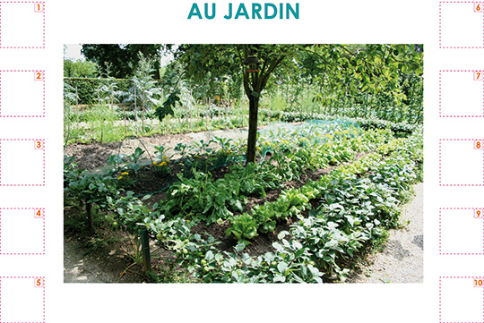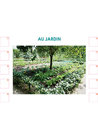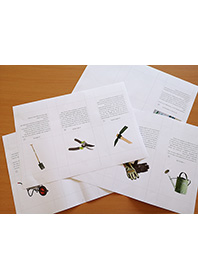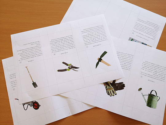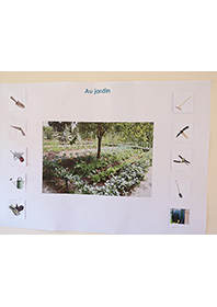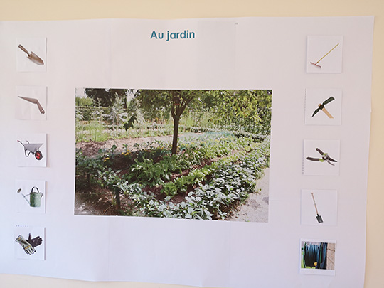 Nous utilisons un panneau géant et des cartes du matériel de jardinage pour animer l’activité.